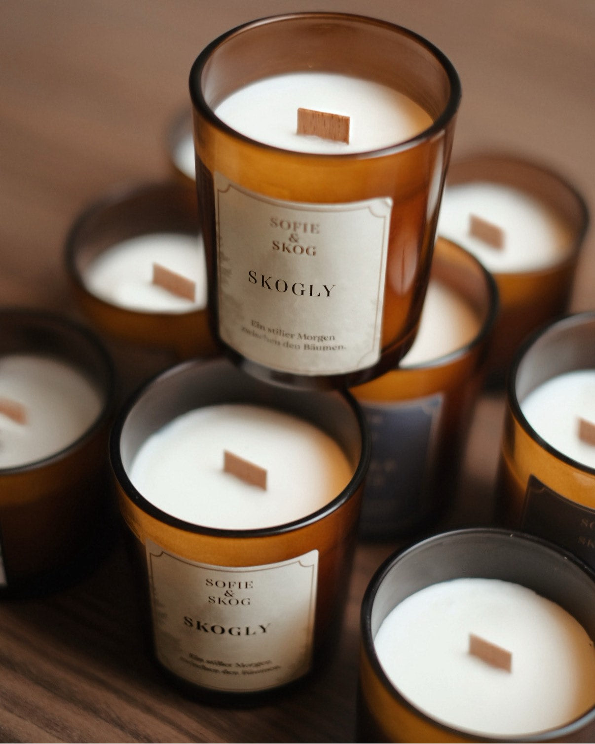 Kerzen, die Geschichten von Wäldern, Licht und Stille erzählen.